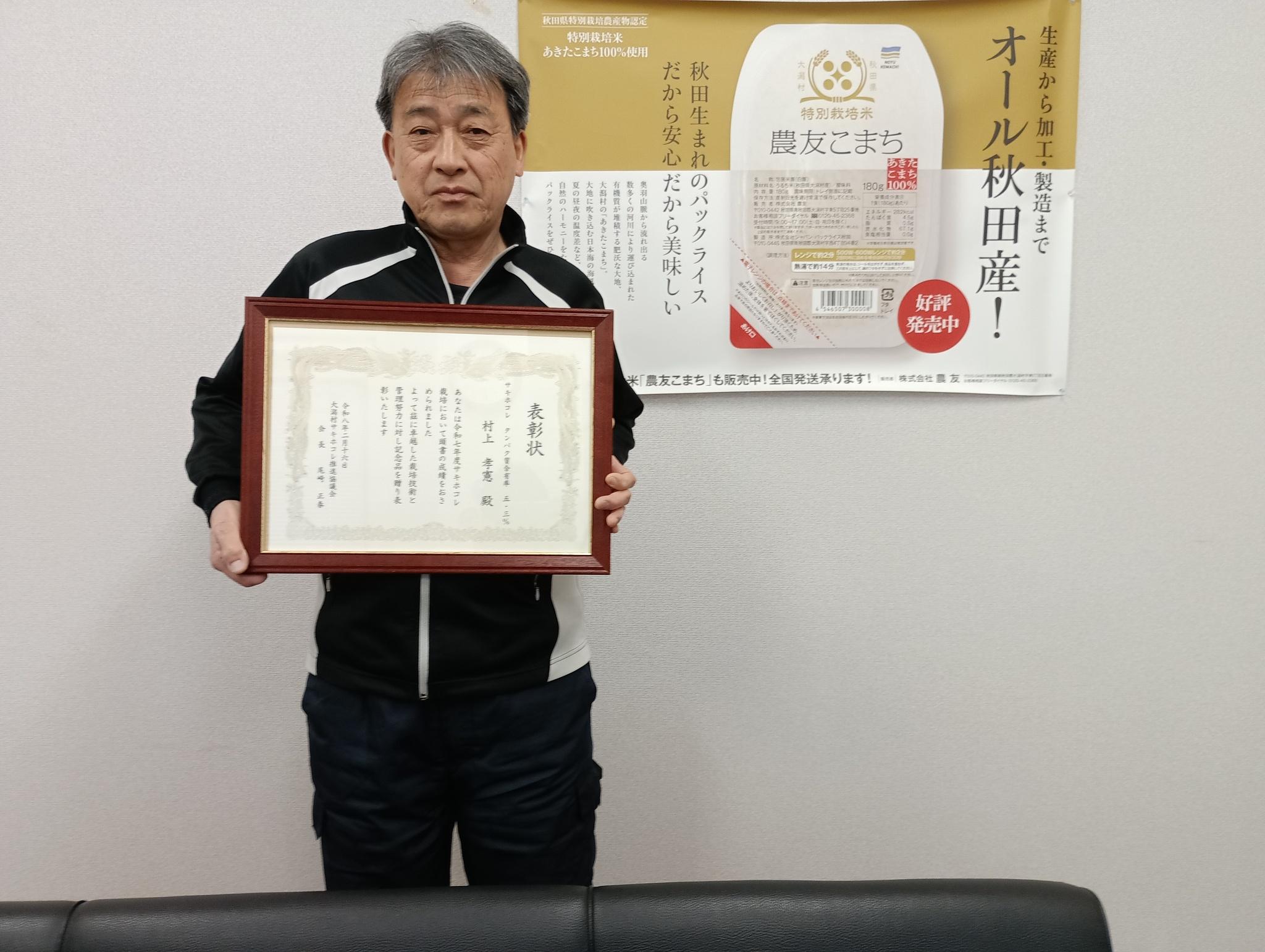トピックス 一覧へ戻る サキホコレ生産者の方が表彰されました。2026-02-18今月16日、JA会館にて大潟村サキホコレ推進協議会の総会が開催され、当社のサキホコレ生産者の方が食味部門にて表彰されました。今年も美味しいサキホコレが収穫できるよう社員一同、心から願っております。
